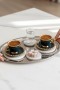 Boncuk formundaki tabak kenarları, altın kaplama kulp ve taban detaylarıyla lüks bir görünüm sunar.
