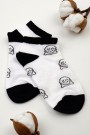 Sevimli kedi yüzü desenli, beyaz zemin üzerine siyah burun-topuk ve manşet detaylı pamuklu patik. Dikişsiz burun yapısı batmayı önler, gün boyu konfor sağlar.