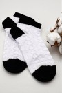 Şık siyah-beyaz kontrastı ve kabartmalı kalp/cable örgüsüyle öne çıkan bu patik çorap, gün boyu konfor için dikişsiz burun yapısına sahiptir. Pamuk ağırlıklı nefes alan dokusu terlemeyi azaltır, esnek bilek kısmı ise kaymayı önleyerek ayağa yumuşak bir kavrama sağlar. Sneaker ve günlük ayakkabılarla görünmez rahatlık sunar.